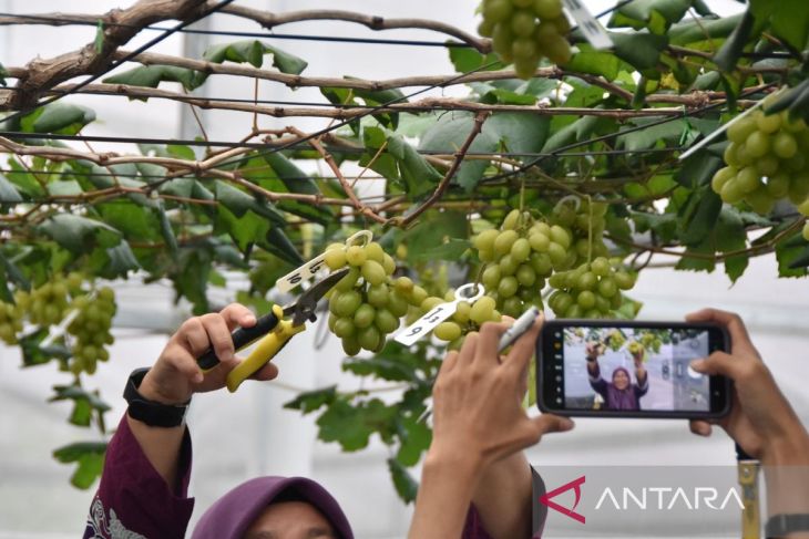 Pengunjung menggunting anggur jenis Ilaria saat panen anggur perdana di kawasan Agribusiness and Technology Park (ATP) IPB University, Desa Cikarawang, Kabupaten Bogor, Jawa Barat, Jumat (6/3/2026). Panen anggur tropis perdana yang mampu tumbuh dan berproduksi dengan baik di Indonesia tersebut menjadi bagian dari riset pengembangan buah lokal yang dilakukan IPB University untuk mendukung peningkatan produksi hortikultura nasional sekaligus mengurangi ketergantungan Indonesia terhadap impor buah. ANTARA Megapolitan/Arif Firmansyah.